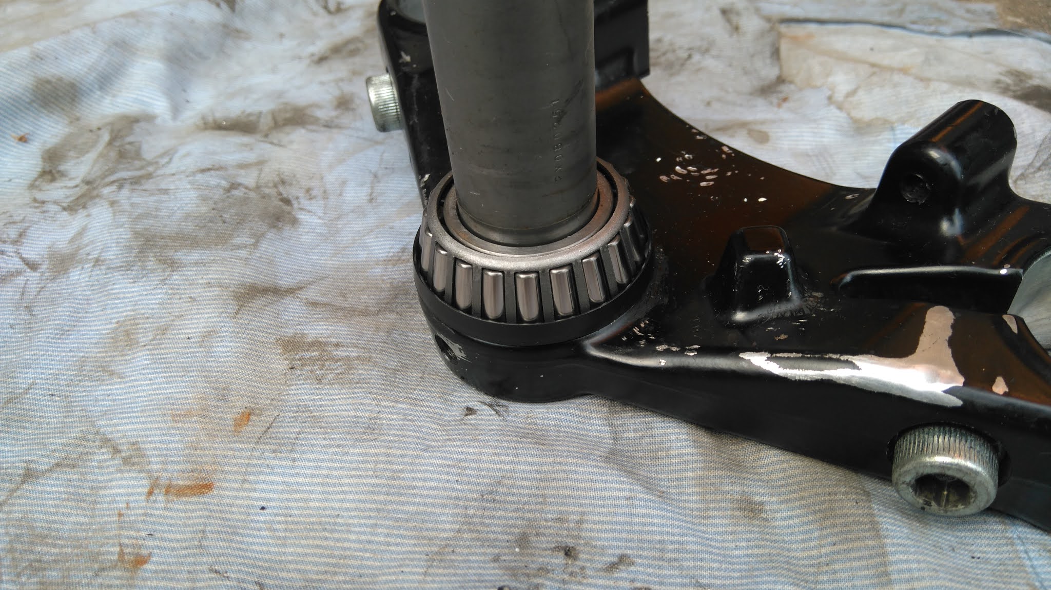 The top yoke actually has the taper roller fixed to the knurled adjuster doodad, which is weird. I was also confused as to how exactly I get the old bearing off without damaging the adjuster..